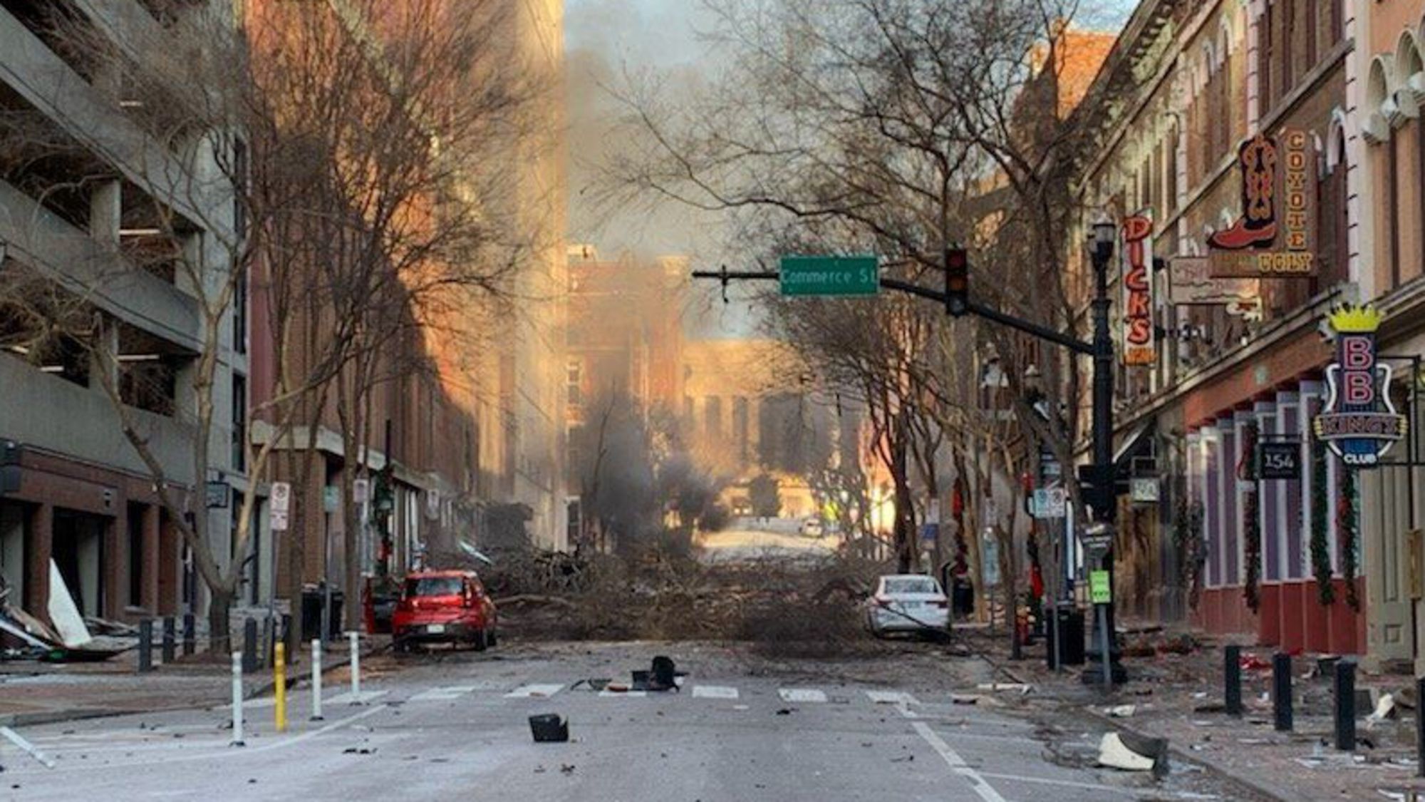 L’explosion a eu lieu à 06H30 (12H30 GMT) en ce matin de Noël, faisant d’importants dégâts sur les façades des bâtiments environnants. De nombreux débris — verre, branches d’arbres, briques — jonchaient le sol, des conduites d’eau ont été percées et des véhicules garés ont été endommagés.