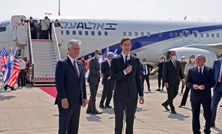 Outre Jared Kushner, le conseiller à la sécurité nationale Robert O’Brien et le responsable du dossier iranien Brian Hook voyagent sur le vol LY971 – nombre du code téléphonique international des Emirats – de la compagnie EL AL, au cockpit décoré des mots « peace, salam et shalom ».