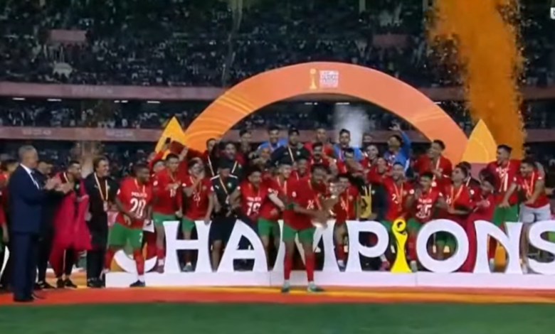 Les Lions de l’Atlas, déjà sacrés en 2018 et 2020, se sont imposés grâce à Youssef Mehri (27e) et Oussama Lamlaoui (44e, 80e), auteur d’un doublé, mais surtout d’un but de victoire anthologique inscrit du milieu du terrain.