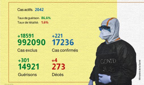 Ce nouveau bilan porte à 17.236 le nombre de contaminations dans le Royaume depuis le premier cas signalé le 2 mars dernier et à 14.921 le nombre des personnes totalement rétablies, soit un taux de guérison de 86,6%, a précisé la cheffe du service des maladies épidémiques à la Direction de l’épidémiologie relevant du ministère de la Santé, Mme Hind Ezzine.