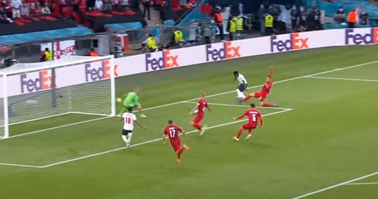 Les Anglais portés par un public acquis à leur cause sont rapidement entrés dans le match, signant de bonnes séquences offensives, mais les Danois n’ont pas tardé à se montrer dangereux. Ils ont été les premiers à ouvrir le score grâce à un magnifique coup franc inscrit par le jeune Mikkel Damsgaard à la 30ème minute.