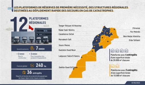 Le programme global relatif à la mise en place des plateformes régionales de réserves de première nécessité permettra également de disposer de réserves stratégiques permettant de répondre à l’équivalent de trois fois les besoins satisfaits suite au séisme d’Al Haouz, outre le développement d’un écosystème national de production d’équipements et de matériels nécessaires au déploiement immédiat des opérations de secours en cas de catastrophes.