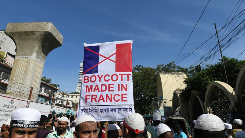 Il s’agit de la troisième manifestation d’ampleur depuis une semaine contre la France et son président depuis une semaine au Bangladesh, pays de 160 millions d’habitants majoritairement musulmans. Les manifestants protestent contre des déclarations d’Emmanuel Macron défendant le droit à la caricature au nom de la liberté d’expression, après la décapitation le 16 octobre par un islamiste d’un enseignant français, Samuel Paty, qui avait montré à ses élèves des caricatures du prophète de l’islam.