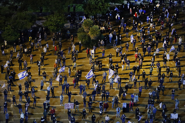 Munis de masques de protection et vêtus majoritairement de noir, les protestataires se tenaient à deux mètres les uns des autres, respectant les mesures en vigueur pour lutter contre la pandémie de Covid-19 qui a officiellement contaminé en Israël plus de 15.000 personnes, dont 199 sont décédées.