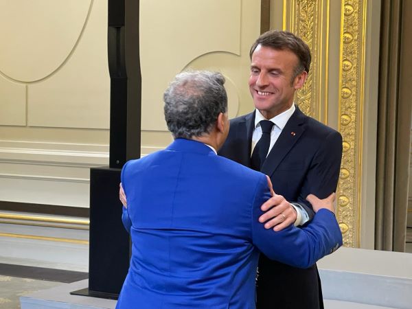 Le président Emmanuel Macron décore Mehdi Qotbi de l’insigne de Grand officier de l’Ordre national du Mérite